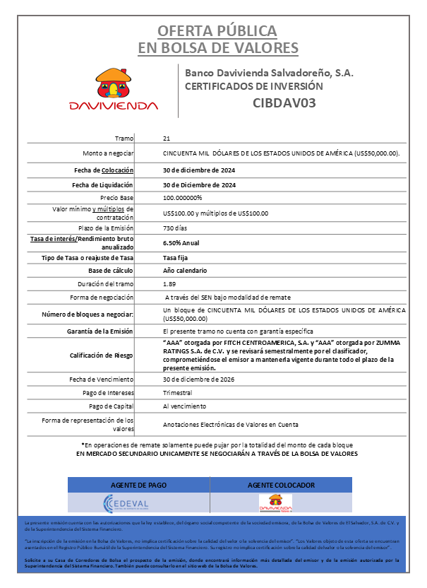 Colocación en Mercado Primario Tramo 21 de la Emisión CIBDAV03 por US$50,000.00