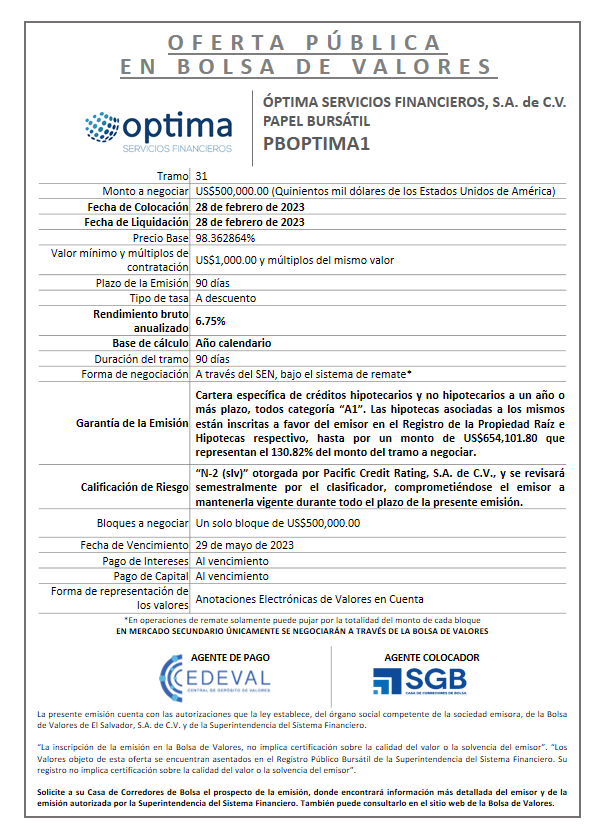 Colocación en Mercado Primario Tramo 31 de la Emisión PBOPTIMA1 por US$500,000.00