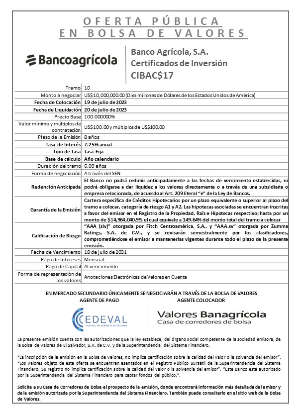 Colocación en Mercado Primario Tramo 10 de la Emisión CIBAC$17 por US$10, 000,000.00