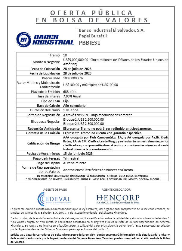 Colocación en Mercado Primario Tramo 18 de la Emisión PBBIES1 por US$5,000,000.00