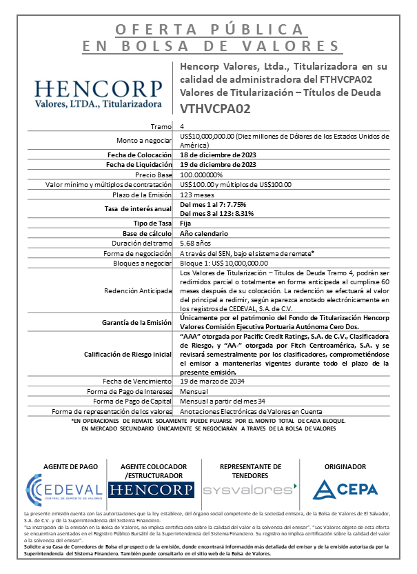 Colocación en Mercado Primario Tramo 4 de la Emisión VTHVCPA02 por US$10,000,000.00