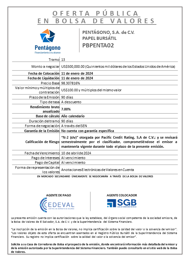Colocación en Mercado Primario Tramo 13 de la Emisión PBPENTA02 por US$500,000.00