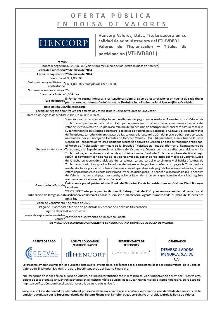 Colocación en Mercado Primario Tramo 5 de la Emisión VTHVDB01 por US$25,000.00