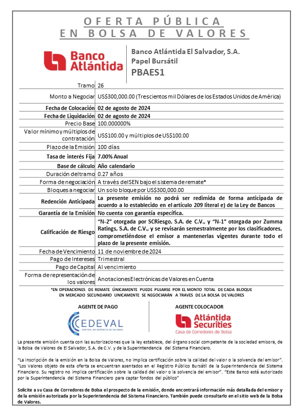Colocación en Mercado Primario Tramo 26 de la Emisión PBAES1 por US$300,000.00