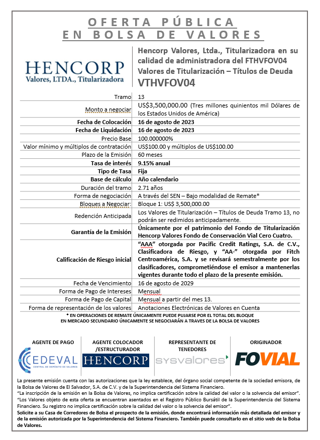 Colocación en Mercado Primario Tramo 13 de la Emisión VTHVFOV04 por US$3,500,000.00