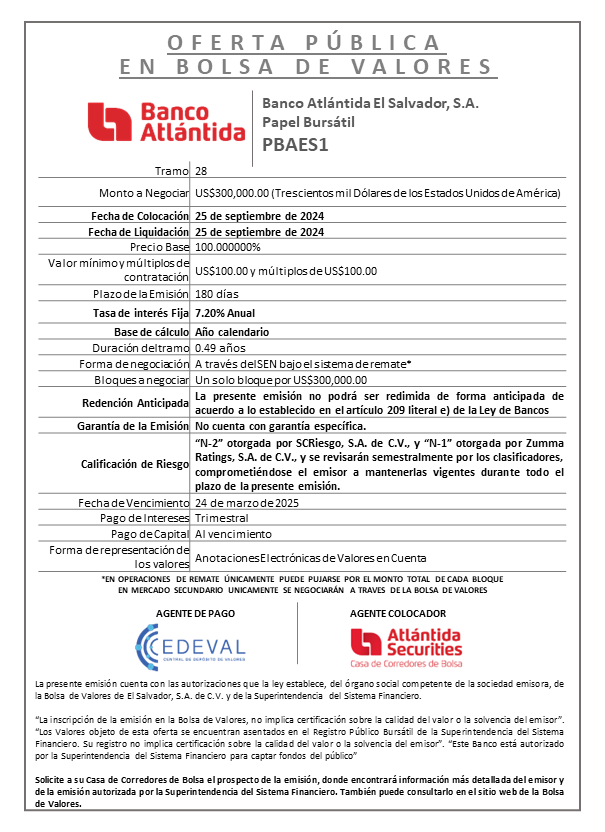 Colocación en Mercado Primario Tramo 28 de la Emisión PBAES1 por US$300,000.00