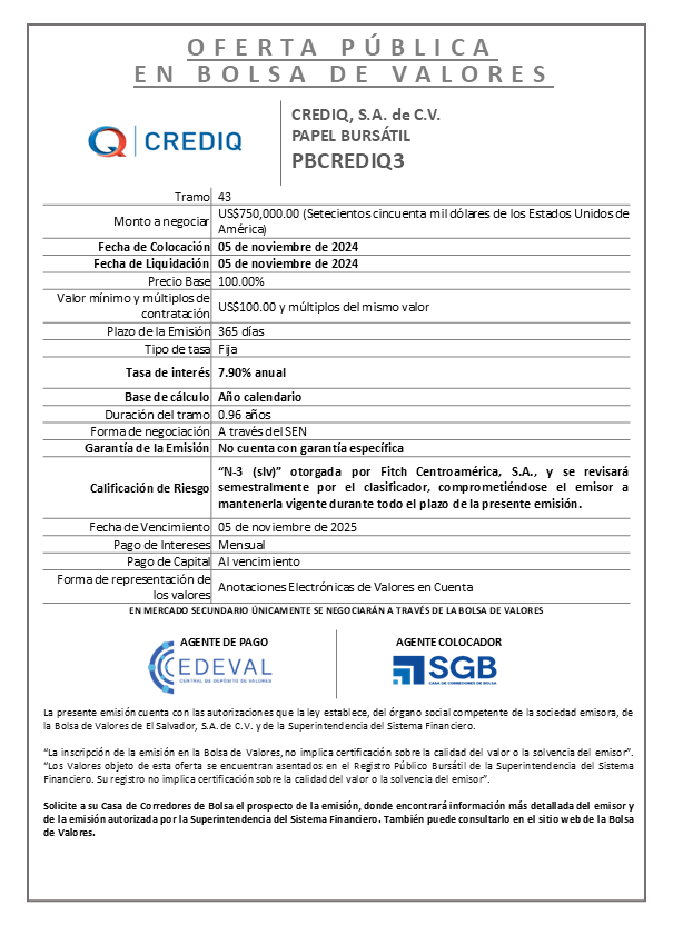 Colocación en Mercado Primario Tramo 43 de la Emisión PBCREDIQ3 por US$750,000.00