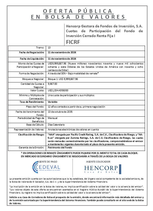 Colocación en Mercado Primario Tramo 13 de la Emisión FICRF