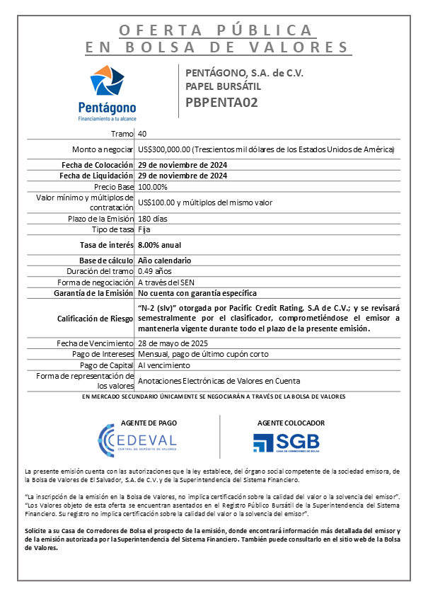 Colocación en Mercado Primario Tramo 40 de la Emisión PBPENTA02 por US$300,000.00