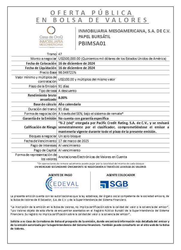 Colocación en Mercado Primario Tramo 47 de la Emisión PBIMSA01 por US$500,000.00
