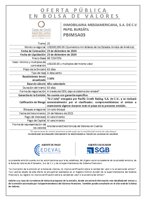Colocación en Mercado Primario Tramo 25 de la Emisión PBIMSA03 por US$500,000.00