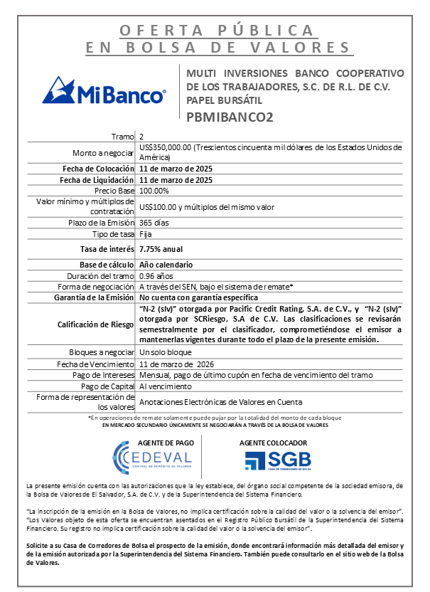 Colocación en Mercado Primario Tramo 2 de la Emisión PBMIBANCO2 por US$350,000.00