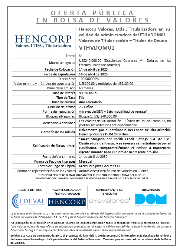 Colocación en Mercado Primario Tramo 34 de la Emisión VTHVDOM01 por US$240,000.00