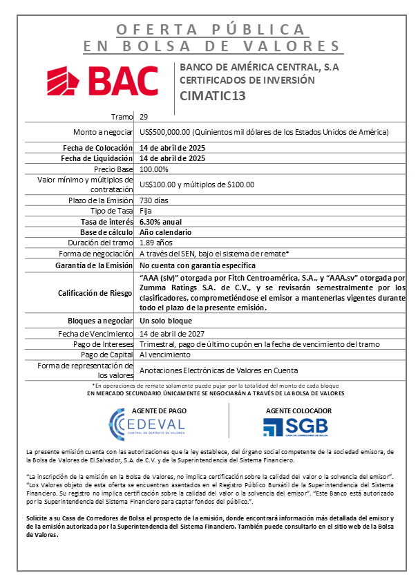 Colocación en Mercado Primario Tramo 29 de la Emisión CIMATIC13 por US$500,000.00