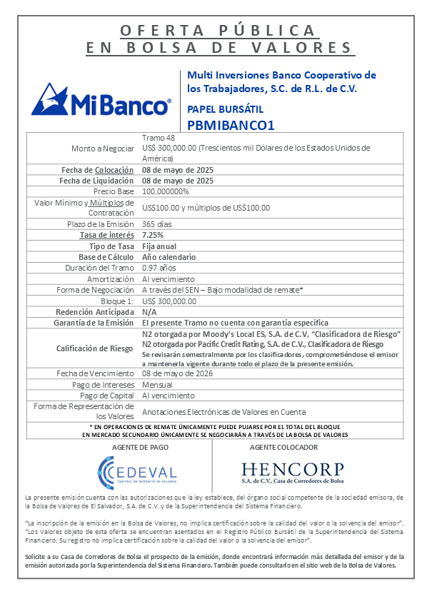 Colocación en Mercado Primario Tramo 48 de la Emisión PBMIBANCO1 por US$300,000.00