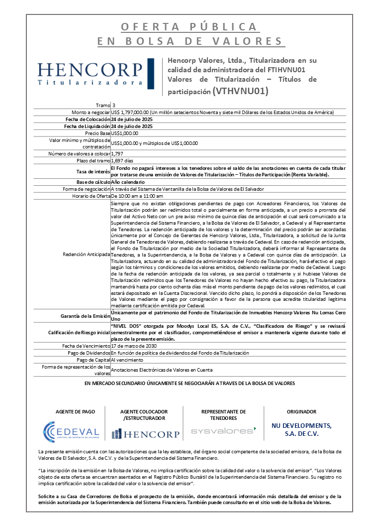 Colocación en Mercado Primario Tramo 3 de la Emisión FTIHVNU01 por US$1,797,000.00