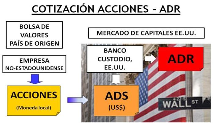 Un ADR es un certificado de depósito emitido en dólares por un banco depositario estadounidense. Cada certificado o ADR se encuentra respaldado por uno o más American Depositary Shares (ADS), que es como se les denomina a las acciones de la empresa extranjera que se encuentran depositadas e inmovilizadas en el banco depositario dentro de los EE.UU. Por lo tanto, los ADS vendrían a ser el activo subyacente de los ADR.